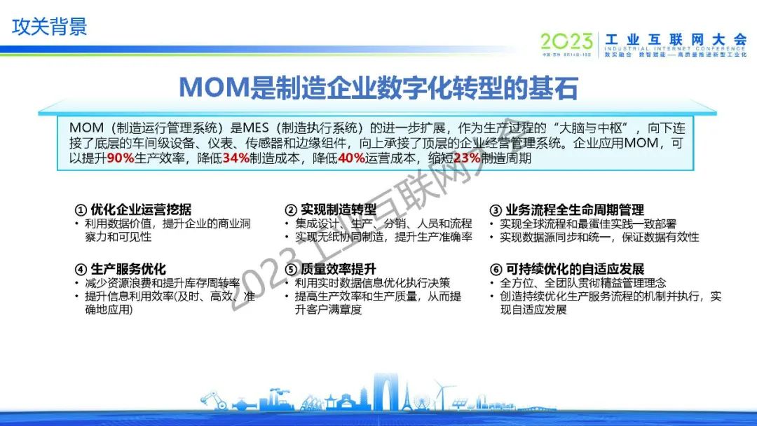 "MOM(制造運行管理系統)是MES(制造執行系統)的進一步擴展,向下連接了底層的車間級設備、儀表、傳感器和邊緣組件,向上承接了頂層的企業經營管理系統,作為生產過程的“大腦與中樞”,MOM是制造企業數字化轉型的基石。"