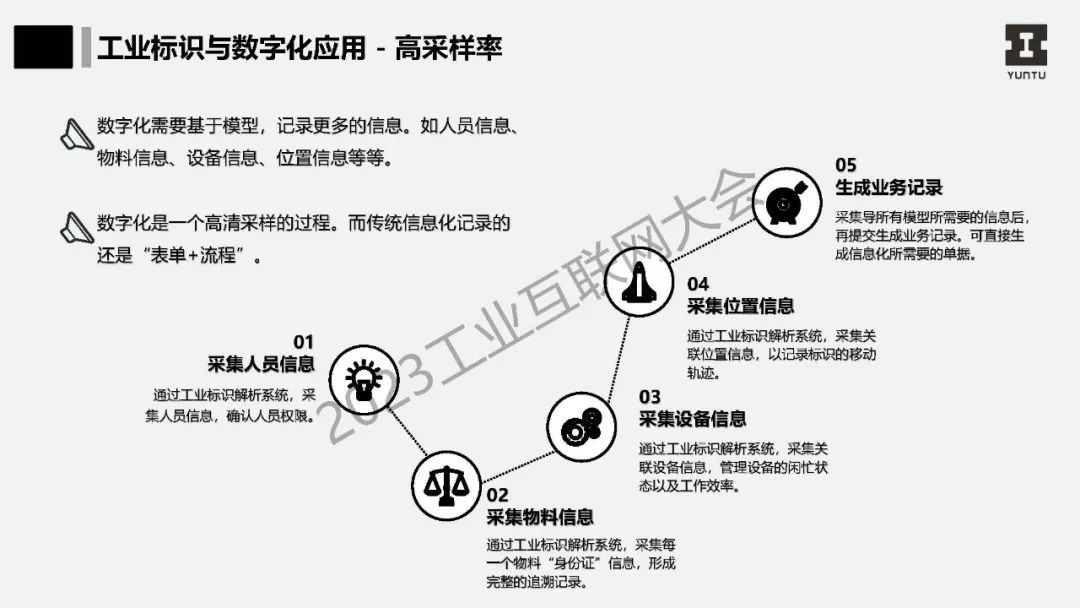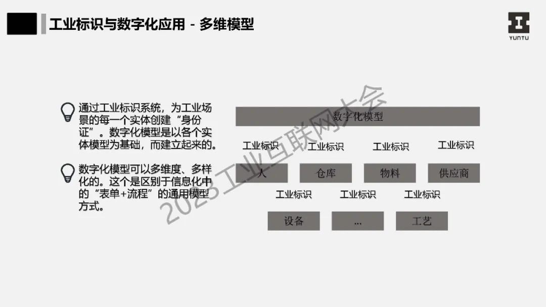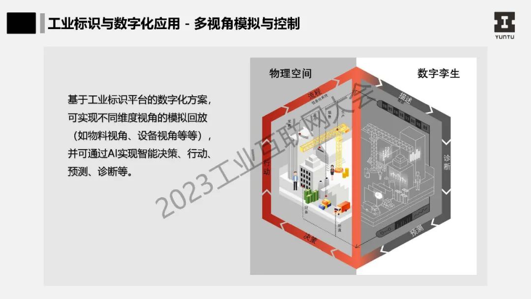 涂若夫介紹了數字化建設的3個要素和5個特性。他表示通過工業標識系統,為工業場景的每一個實體創建“身份證”。數字化模型是以各個實體模型為基礎,而建立起來的。數字化模型可以多維度、多樣化的。這個是區別于信息化中的“表單+流程”的通用模型方式。同時,基于工業標識平臺的數字化方案,可實現不同維度視角的模擬回放(如物料視角、設備視角等等),并可通過AI實現智能決策、行動、預測、診斷等。