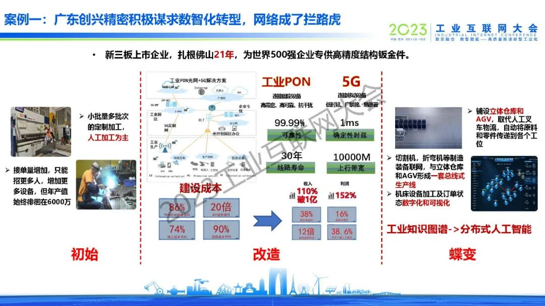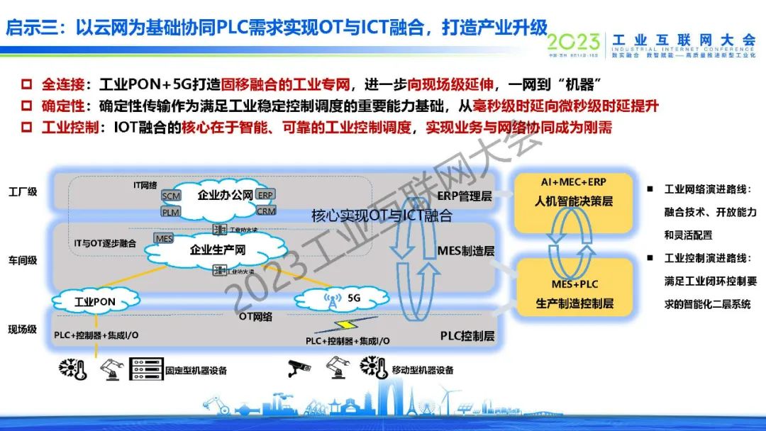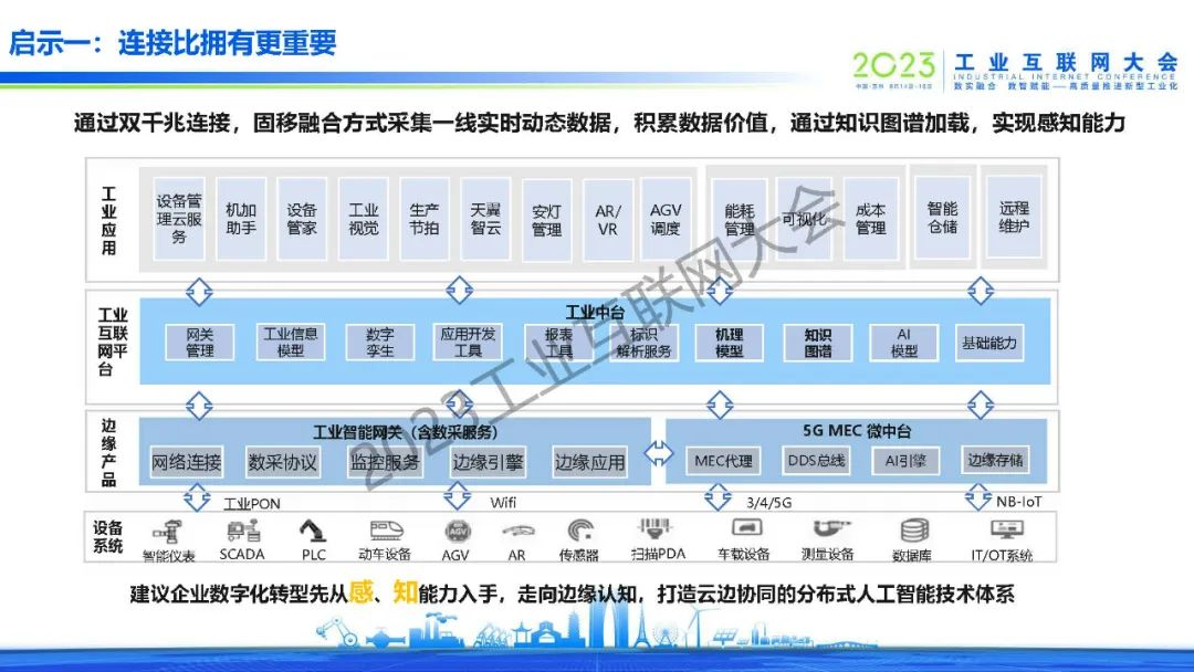 張東建議通過雙千兆連接,固移融合方式采集一線實時動態(tài)數(shù)據(jù),積累數(shù)據(jù)價值,通過知識圖譜加載,實現(xiàn)感知能力,企業(yè)數(shù)字化轉(zhuǎn)型先從感、知能力入手,走向邊緣認知,打造云邊協(xié)同的分布式人工智能技術(shù)體系,以云網(wǎng)為基礎(chǔ)協(xié)同PLC需求實現(xiàn)OT與ICT融合,打造產(chǎn)業(yè)升級。