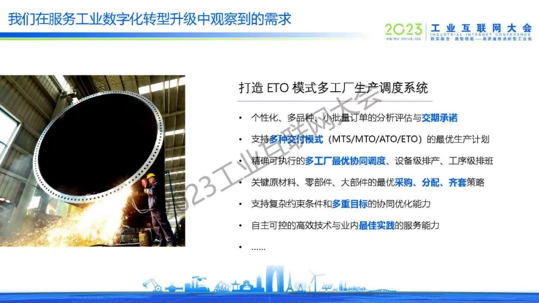 “裝備制造企業(yè)的數(shù)字化轉(zhuǎn)型就是打造 ETO 模式多工廠生產(chǎn)調(diào)度系統(tǒng)。它涵蓋了很多信息的抽象性需求描述,可能包括多品種,小批量訂單的交期承諾,可能包括個(gè)性化、多品種、小批量訂單的分析評(píng)估與交期承諾、支持多種交付模式(MTS/MTO/ATO/ETO)的最優(yōu)生產(chǎn)計(jì)劃、精確可執(zhí)行的多工廠最優(yōu)協(xié)同調(diào)度、設(shè)備級(jí)排產(chǎn)、工序級(jí)排班等?!?/p>