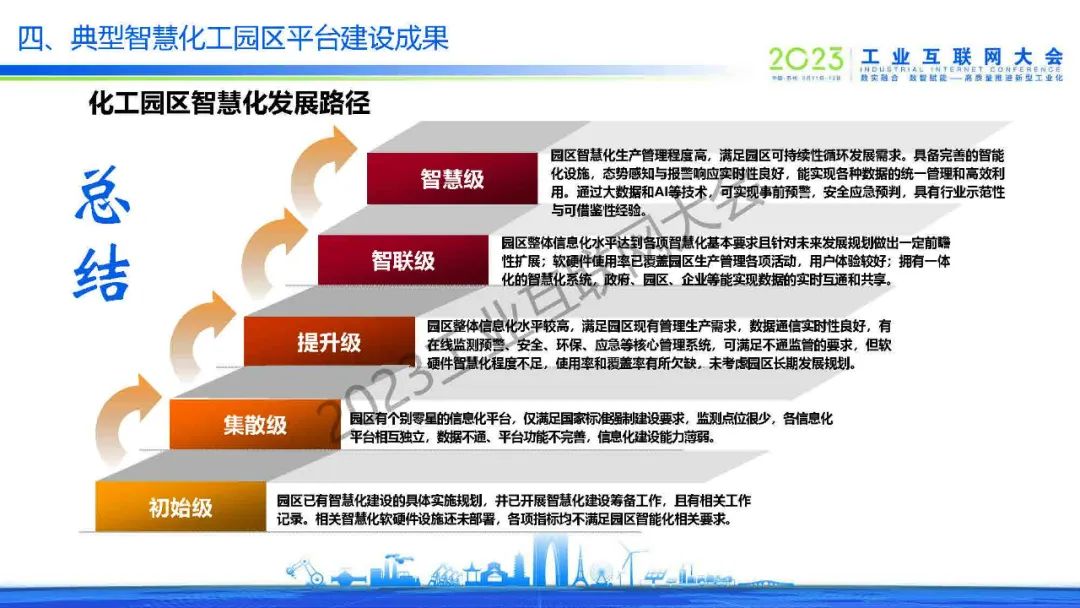 馬從越介紹,智慧化工園區(qū)是以信息與通信技術(shù)為支撐,圍繞安全生產(chǎn)、環(huán)境管理、應急管理、封閉化管理、運輸管理、能原管理、辦公管理、公共服務(wù)和保障體系等領(lǐng)域,通過數(shù)據(jù)整合與信息平臺建設(shè)實現(xiàn)智慧化管理與高效運行的化工園區(qū)。化工園區(qū)智慧化發(fā)展路徑從初始級、集散級、提升級、智聯(lián)級到最后的智慧級。