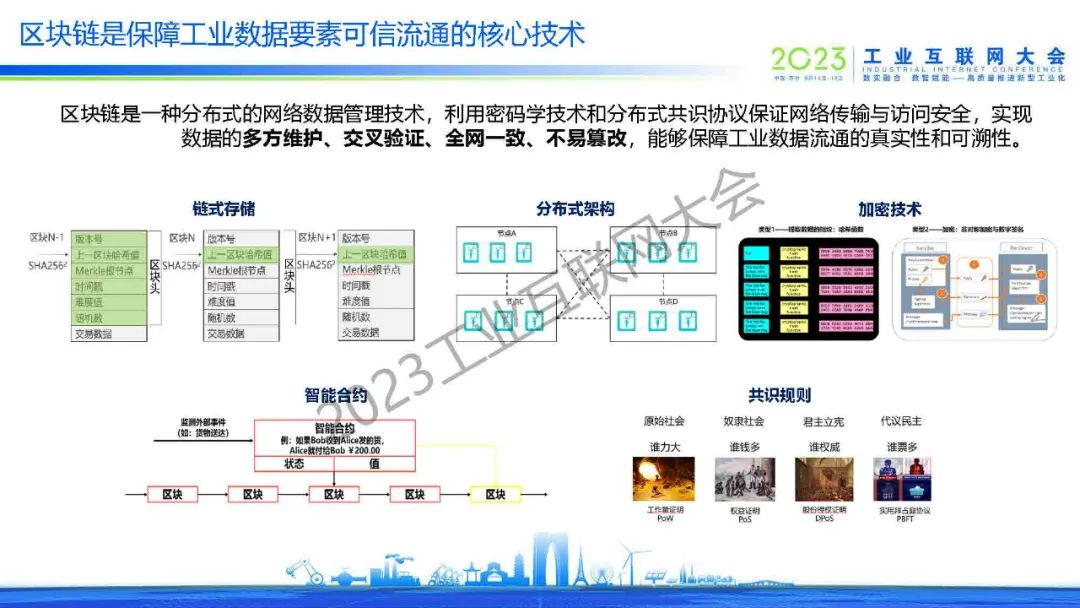 “區(qū)塊鏈?zhǔn)且环N分布式的網(wǎng)絡(luò)數(shù)據(jù)管理技術(shù),利用密碼學(xué)技術(shù)和分布式共識(shí)協(xié)議保證網(wǎng)絡(luò)傳輸與訪問(wèn)安全,實(shí)現(xiàn)數(shù)據(jù)的多方維護(hù)、交叉驗(yàn)證、全網(wǎng)一致、不易篡改,能夠保障工業(yè)數(shù)據(jù)流通的真實(shí)性和可溯性。”