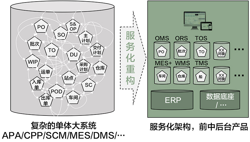 傳統(tǒng)的供應鏈IT系統(tǒng)是煙囪式的,隨著業(yè)務增長、需求變化加快,會出現(xiàn)用戶體驗差、重復建設、響應周期長等問題,不能適應業(yè)務發(fā)展的需要。通過對復雜的單體大系統(tǒng)進行服務化改造,讓服務化子系統(tǒng)融合業(yè)務要素、應用要素和數(shù)據(jù)要素,可以實現(xiàn)業(yè)務、數(shù)據(jù)與系統(tǒng)功能的銜接(如圖2)。