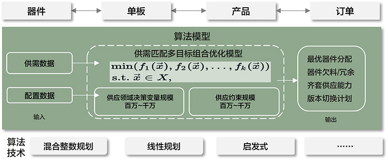 比如,在資源準備的場景中,華為供應鏈面臨著千萬級數(shù)據(jù)規(guī)模,億級計算規(guī)模的復雜業(yè)務場景。但是華為基于線性規(guī)劃、混合整數(shù)規(guī)劃、啟發(fā)式算法等求解方法的組合,構建了從器件、單板到產(chǎn)品、訂單之間的雙向模擬引擎(如圖3)。在錯綜復雜的產(chǎn)品結構樹和供應網(wǎng)絡節(jié)點中,快速找到資源準備的最優(yōu)解,在供應能力最大化的同時實現(xiàn)存貨可控。