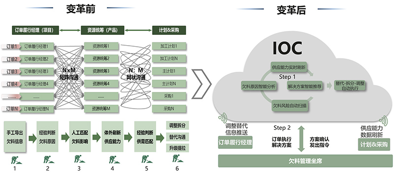 IOC打破了功能的“墻”和流程間的“堤”,實現(xiàn)關鍵業(yè)務場景下跨功能、跨流程和跨節(jié)點的合成運營,以及異常發(fā)現(xiàn)與問題解決之間的快速閉環(huán)。以華為深圳供應中心訂單履行異常管理為例(如圖4):在變革前,訂單履行異常管理是一項高能耗業(yè)務,需要100多名訂單履行經(jīng)理分別與統(tǒng)籌、計劃、采購等角色溝通,再進行分析和處理;構建IOC后,系統(tǒng)可以自動發(fā)現(xiàn)異常、定位、分析原因并提供方案建議,從之前的人工操作變成了系統(tǒng)自動處理加人工輔助確認,作業(yè)效率提升了31%。