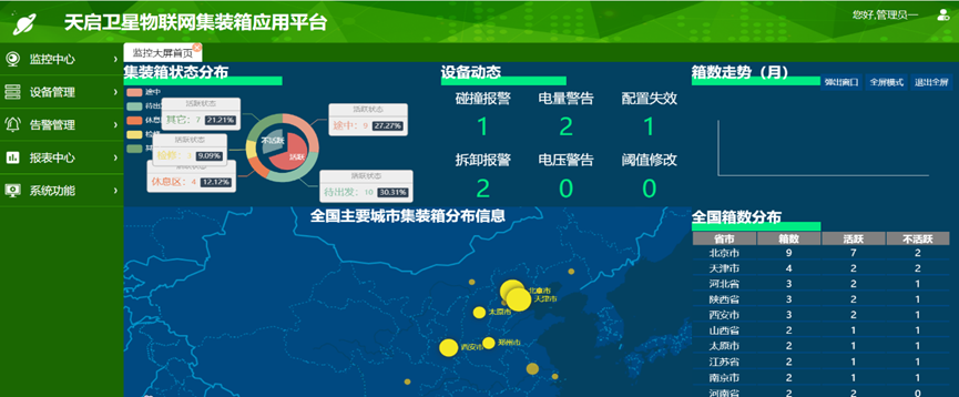 系統中集集團及戶提供集裝箱狀態實時監控、歷史狀態查詢、集裝箱貨運合同管理等基本查詢和管理功能。通過衛星終端接入,打造天啟衛星物聯網集裝箱供應鏈管理平臺,可通過多模通信鏈路,兼容多樣化通信數據格式,開放標準數據接口,方便各類用戶開發業務應用。