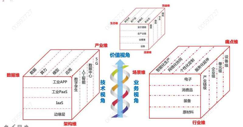 基于雙螺旋模型,可以從三大視角九大維度來探究制造業數字化轉型。一是價值視角:連接維、效益維、生產維;二是技術視角:架構維、產業維、數據維;三是業務視角:行業維、痛點維、場景維。