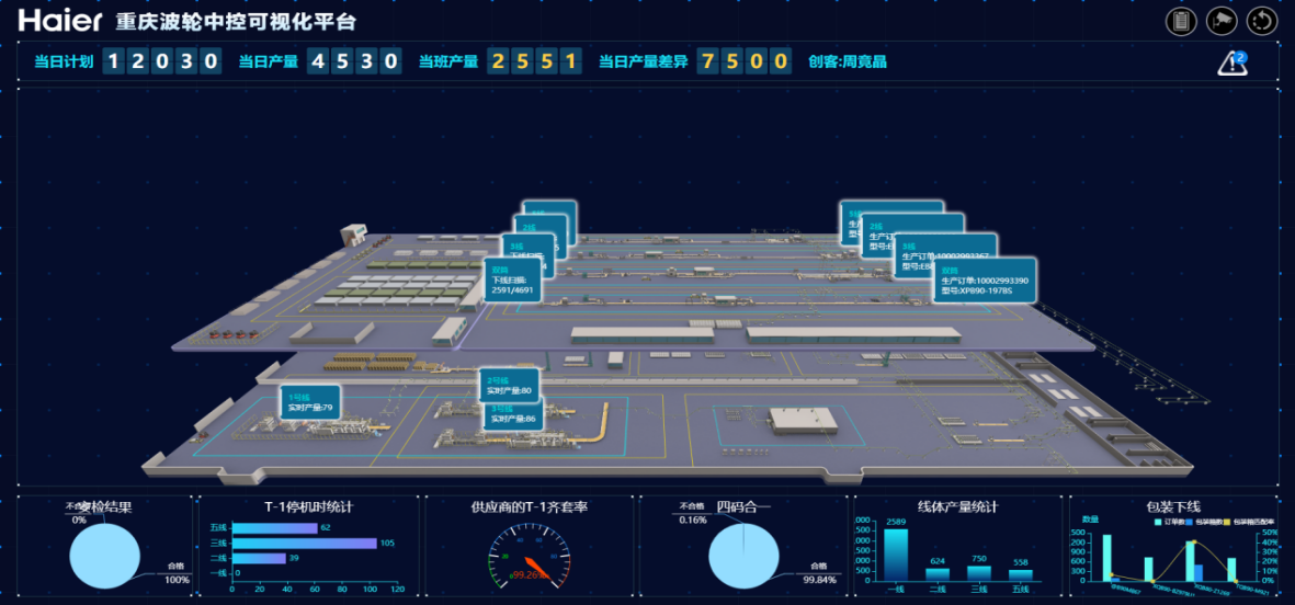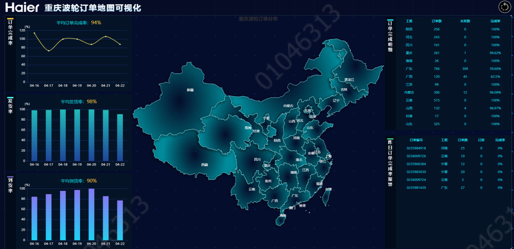 衣聯網重慶研究院整合各方資源,對重慶波輪工廠的原材料入廠,前工序生產,總裝生產及檢驗,成品下線入庫及發運引入中控室大數據中心進行全流程的數據整合,實現對工廠數據進行預防性分析。大數據中央控制室分為十個部分:訂單地圖可視、物流3D模擬、中央控制室、前工序總控、總裝經營體總控、總裝1線總控、總裝2線總控、總裝3線總控、總裝5線總控、產品工藝操作介紹。