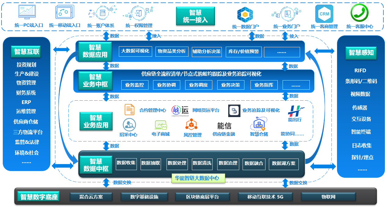 首先針對各業(yè)務(wù)模塊,構(gòu)建核心智慧業(yè)務(wù)應(yīng)用層:包括電子商城平臺、智慧物流平臺、智慧集中倉儲平臺、智慧供應(yīng)鏈金融平臺、物資業(yè)務(wù)追蹤與可視化平臺、合約管理中心、項目履約跟蹤平臺、智慧風(fēng)控系統(tǒng)、能出行智慧商旅系統(tǒng)、統(tǒng)一客商管理系統(tǒng)。