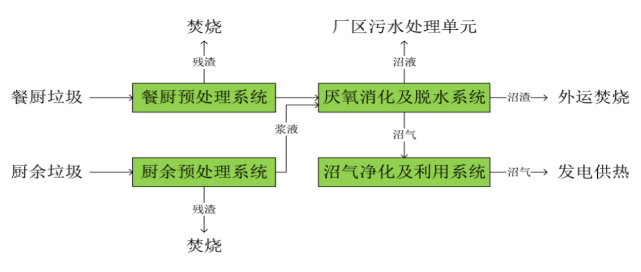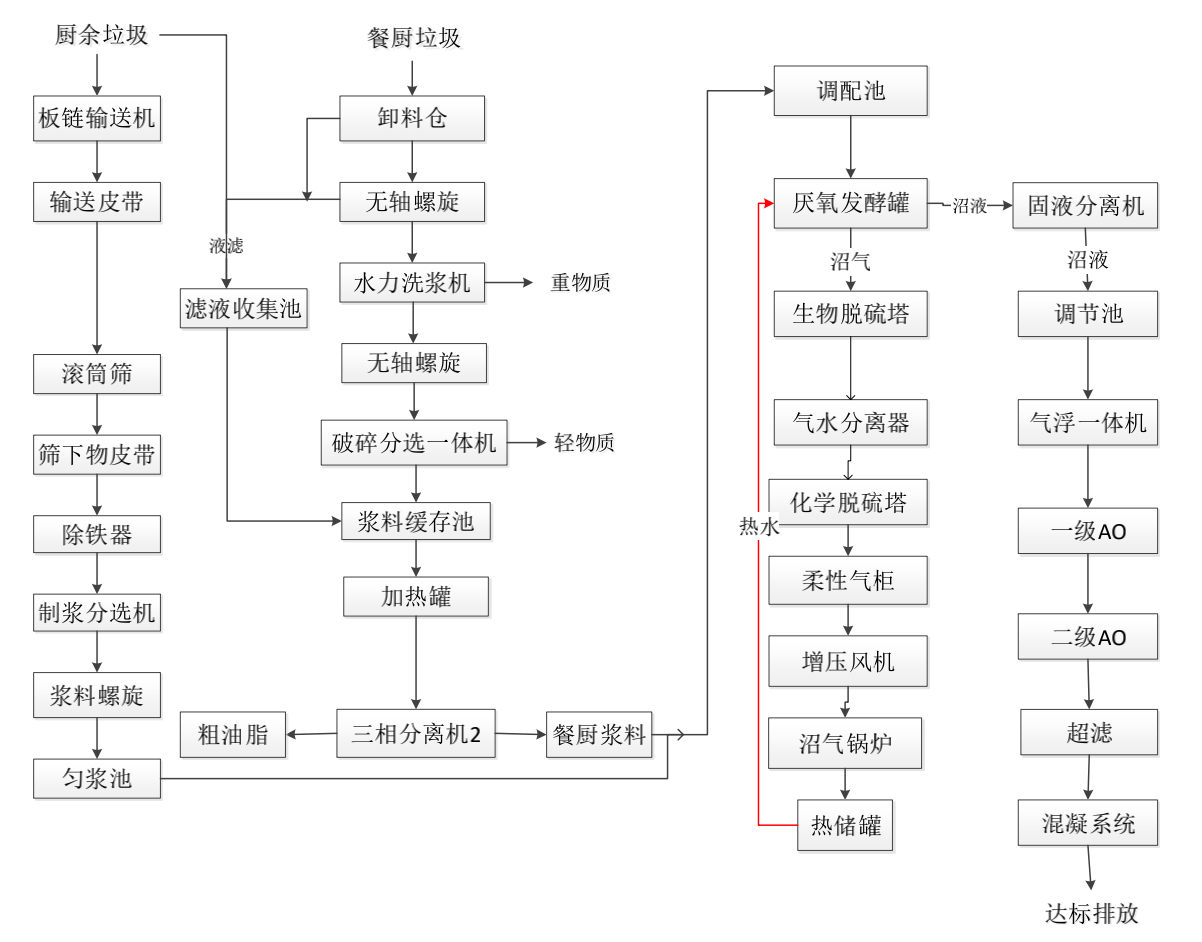 餐廚廢棄物和廚余廢棄物進(jìn)場(chǎng)地磅稱重后卸至接投料倉(cāng),進(jìn)入不同的預(yù)處理生產(chǎn)線。餐廚垃圾通過(guò)無(wú)軸螺旋輸送進(jìn)入水力洗漿機(jī)、破碎分選一體機(jī)分別去除重物質(zhì)和塑料輕物質(zhì),制漿后與廢棄油脂混合,經(jīng)過(guò)加熱后進(jìn)入三相分離機(jī),進(jìn)行全物料提油,三相分離之后的漿料與分選破碎制漿的廚余垃圾漿料混合泵入CSTR厭氧單元進(jìn)行厭氧消化,產(chǎn)生的沼氣經(jīng)生物脫硫系統(tǒng)凈化后進(jìn)入氣柜暫存,經(jīng)凈化增壓后發(fā)電和供鍋爐燃燒。產(chǎn)生的沼渣沼液進(jìn)入固液分離系統(tǒng)實(shí)現(xiàn)固液分離,分離出的沼渣送入焚燒廠,沼液進(jìn)入污水處理單元處理,處理達(dá)標(biāo)后進(jìn)入城鎮(zhèn)排水管網(wǎng)排放。