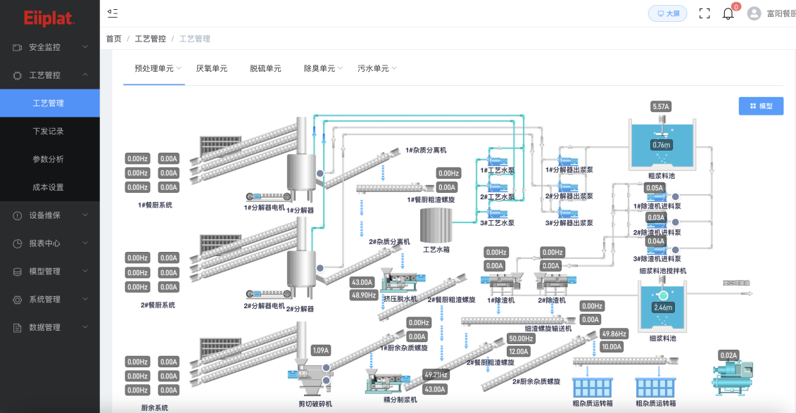 富陽(yáng)區(qū)循環(huán)經(jīng)濟(jì)產(chǎn)業(yè)園餐廚垃圾處置項(xiàng)目?jī)?nèi)各工藝單元運(yùn)行情況良好、各類數(shù)據(jù)采集相關(guān)傳感器、智能網(wǎng)關(guān)硬件設(shè)施完備,以此為基礎(chǔ)利用數(shù)字技術(shù)賦能富陽(yáng)區(qū)循環(huán)經(jīng)濟(jì)產(chǎn)業(yè)園餐廚垃圾處置項(xiàng)目降碳。