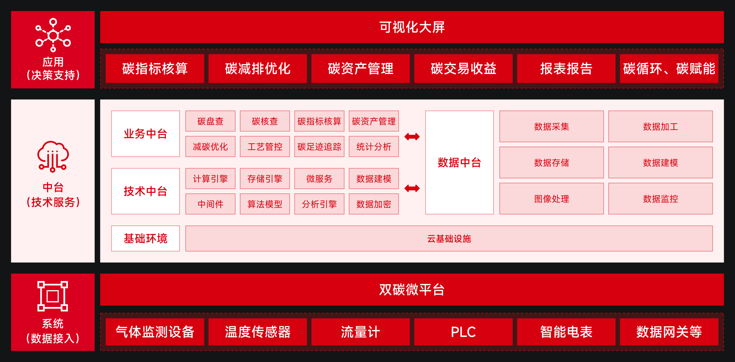 富陽(yáng)區(qū)循環(huán)經(jīng)濟(jì)產(chǎn)業(yè)園餐廚垃圾處置項(xiàng)目實(shí)施的雙碳數(shù)據(jù)中心能夠有效地解決以上問(wèn)題,并具備良好的實(shí)施成效。雙碳數(shù)據(jù)中心是基于E平臺(tái)(Eiiplat環(huán)境產(chǎn)業(yè)互聯(lián)網(wǎng)平臺(tái))和微平臺(tái),利用國(guó)家備案方法學(xué)打造,并通過(guò)雙碳微平臺(tái)落地應(yīng)用的軟硬件配套的智慧化系統(tǒng)。通過(guò)雙碳微平臺(tái)及相關(guān)傳感設(shè)備進(jìn)行數(shù)據(jù)采集,在中臺(tái)進(jìn)行數(shù)據(jù)傳輸、存儲(chǔ)與優(yōu)化,支撐上層功能實(shí)現(xiàn),為不同用戶提供服務(wù)。