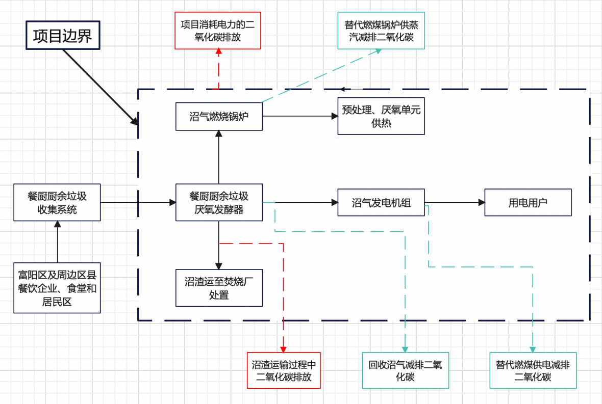 根據(jù)國(guó)家發(fā)改委備案的方法學(xué)CMS-001-V02用戶使用的熱能,可包括或不包括電能和CMS-016-V01通過(guò)厭氧分解進(jìn)行甲烷回收,項(xiàng)目碳核算的邊界為餐廚廚余垃圾從產(chǎn)生單位運(yùn)輸至處理廠后,進(jìn)行厭氧發(fā)酵,產(chǎn)生沼氣一部分進(jìn)入燃燒鍋爐產(chǎn)生蒸汽進(jìn)行供熱,另一部分進(jìn)入沼氣發(fā)電機(jī)發(fā)電上網(wǎng),產(chǎn)生的沼渣外運(yùn)至焚燒廠焚燒。