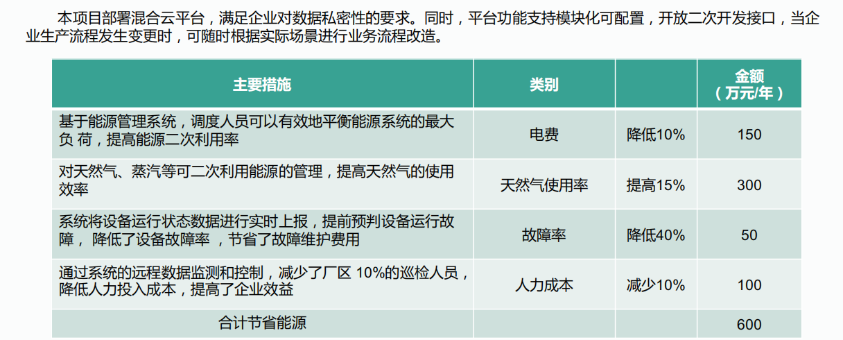 降本增效綜合實(shí)施效益顯著。一是節(jié)省能源成本。基于能源管理系統(tǒng),調(diào)度人員可以有效地平衡能源系統(tǒng)的最大負(fù)荷,一年電費(fèi)支出降低10%。二是提高能源二次利用率。對(duì)天然氣、蒸汽等可二次利用能源的管理,提高天然氣的使用效率15%。三是降低設(shè)備故障率。系統(tǒng)將設(shè)備運(yùn)行狀態(tài)數(shù)據(jù)進(jìn)行實(shí)時(shí)上報(bào),提前預(yù)判設(shè)備運(yùn)行故障,降低設(shè)備故障率40%。四是減少人力投入,通過系統(tǒng)的遠(yuǎn)程數(shù)據(jù)監(jiān)測(cè)和控制,可減少廠區(qū)10%的巡檢人員。