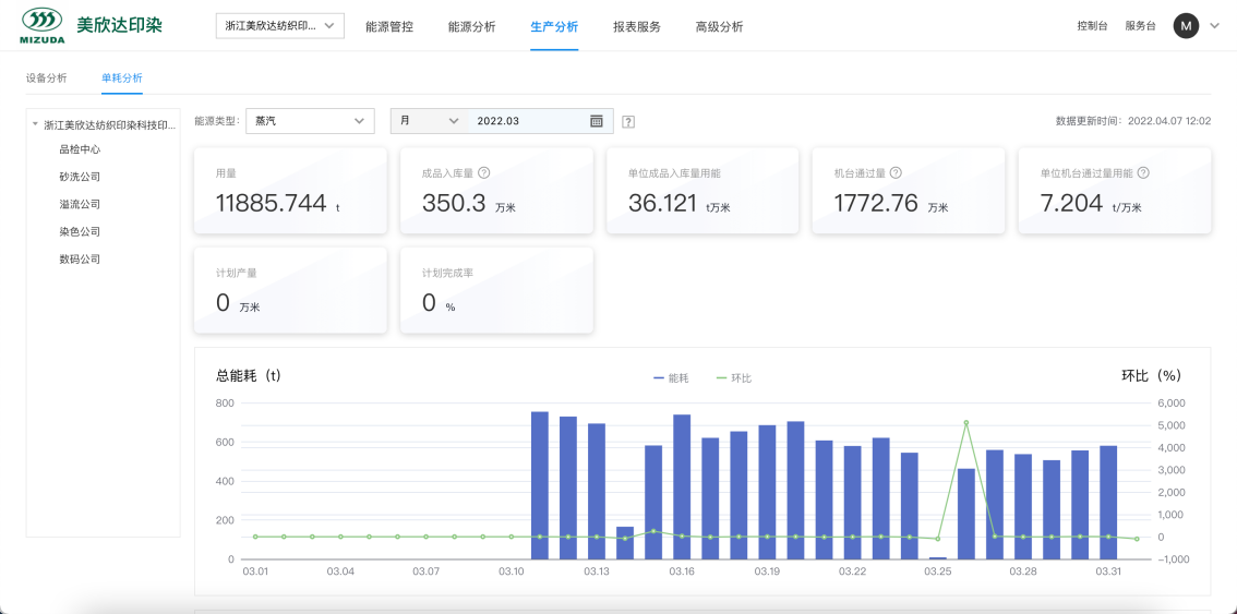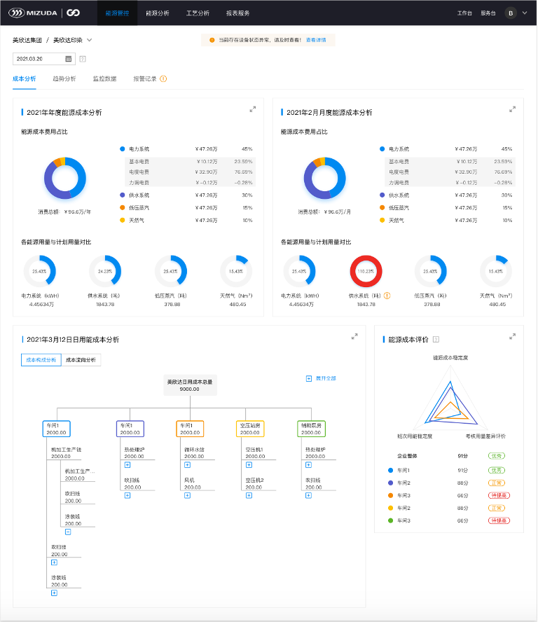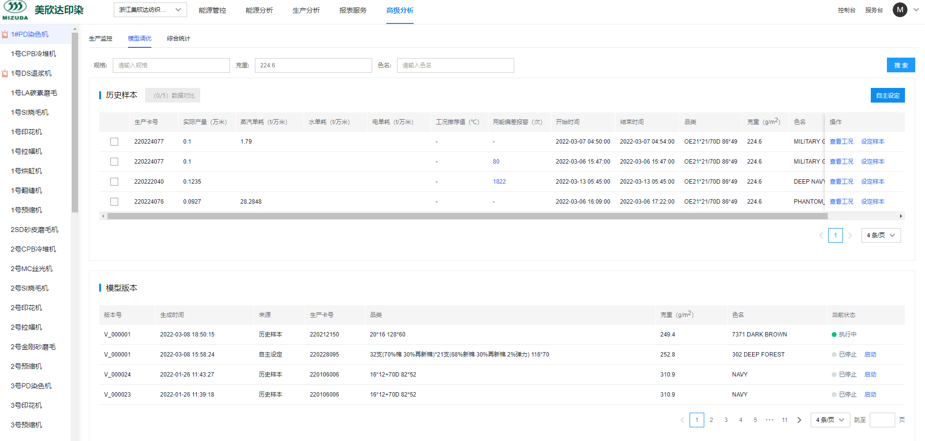 解決方案:美欣達印染產線采用典型的長車染色工藝,設備繁多,工藝復雜,產線長達幾百米,度能系統為給企業提供了基于模型的高級節能分析模塊。深入長車印染產線與工藝,基于能耗數據、生產數據、工藝數據,多維數據建立模型,找到最優能耗,反饋優化參數建議,識別能源偏差與浪費,幫助企業透明化生產管理,及時調優控制,達到精準化節能降碳。