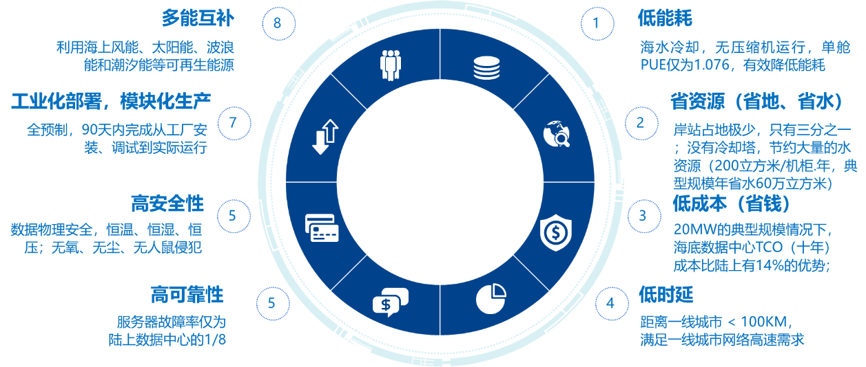依靠海水自然冷源、無氧、無塵、模塊化部署等條件,海底數據中心在能耗、土地、水資源、故障率、交付周期等方面較陸地數據中心有著獨特的優勢。根據清華大學傳熱與能源利用北京重點實驗室出具的能效測試報告,海底數據中心的單艙PUE值為1.076。這一指標保證了海底數據中心節能降耗,在其生命周期內具備比陸地數據中心更好的經濟優勢。由于海底數據中心散熱不需要消耗水,運營過程中每年每個機柜可以節約200立方米的水資源。海底數據中心通過工程預制實現了快速部署,建設由“工地”遷移到“工廠”,具備了工業化的本質,可實現一體化交付,規?;\維。我國東部地區具有臨海的區位優勢,集聚了全國超過45%的人口和近60%的GDP。對于上海、深圳這一類沿海超大城市,海底數據中心的價值特點尤為突出。