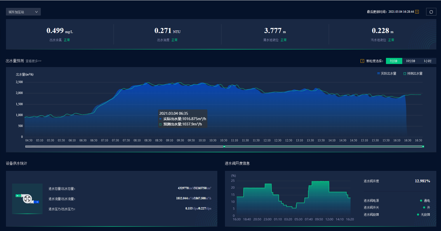 1目前常規泵房的供水壓力控制為變頻恒壓,此種壓力設定方法不夠靈活與智能,沒有把控用戶真正的用量需求,不能及時的根據用戶需求的變化來做出調整及響應,用戶用水體驗差,管網平均壓力偏高,增加了管網漏損的風險。且泵機組合以及泵組輪換依賴人工經驗,泵站未必工作在當前工況下最優工作點,不利于節能降耗。水務大腦通過折線圖和陰影圖組合,直觀的展示實際出水量和預測出水量的信息,模型精度在99%以上。