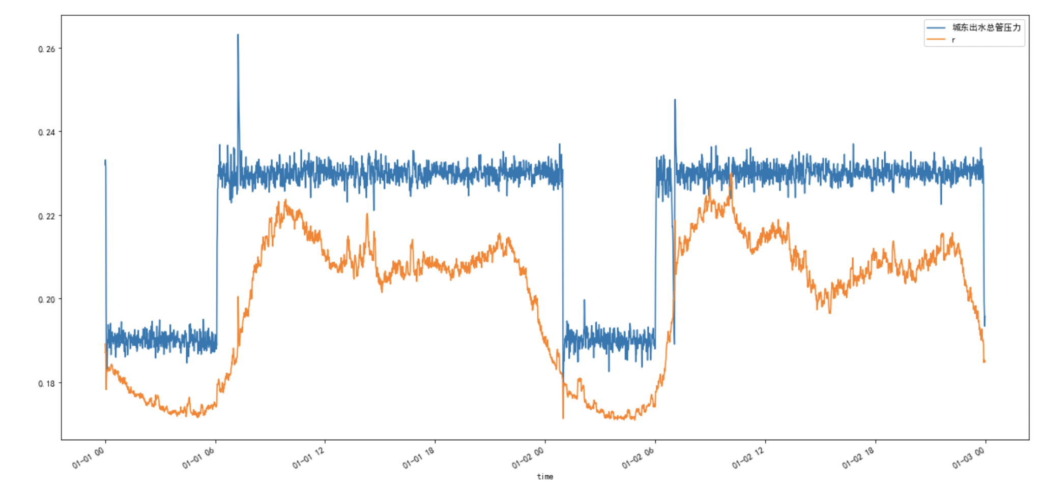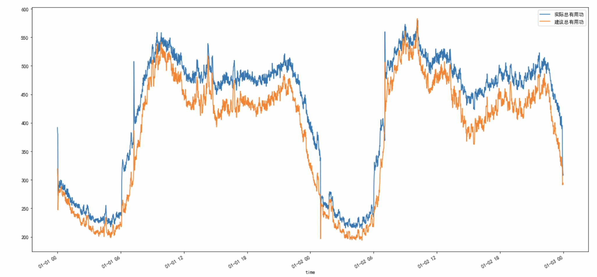 3通過函數進行擬合,觀察歷史某兩日出水管的實際壓力和建議壓力,中間的面積為實際的節能空間;經過計算,為客戶提出在某兩年,使用建議壓力可以節能8%的電能。