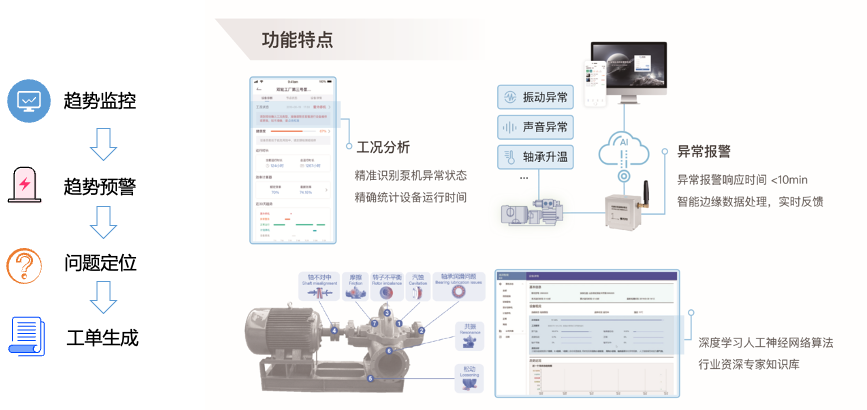 通過振動、電流、電壓、溫度、噪聲等傳感器,實時監測水泵的運行狀態,基于實時及歷史運行數據,結合時域、頻域、時頻域等信號處理和分析方法,利用機理及機器學習等技術,提取一系列狀態指標,根據歷史數據結合專家知識提取分析指標,進而監控設備運行情況,實現針對泵機的趨勢監控、趨勢預警、問題定位、工單生成的流程化應用功能。在項目中,實現了精準識別泵機異常狀態、精準統計設備運行時間,識別泵機的振動異常、聲音異常、軸承升溫等問題,并迅速發出異常報警,異常報警響應時間<10min,智能邊緣數據處理能夠實現實時反饋。
