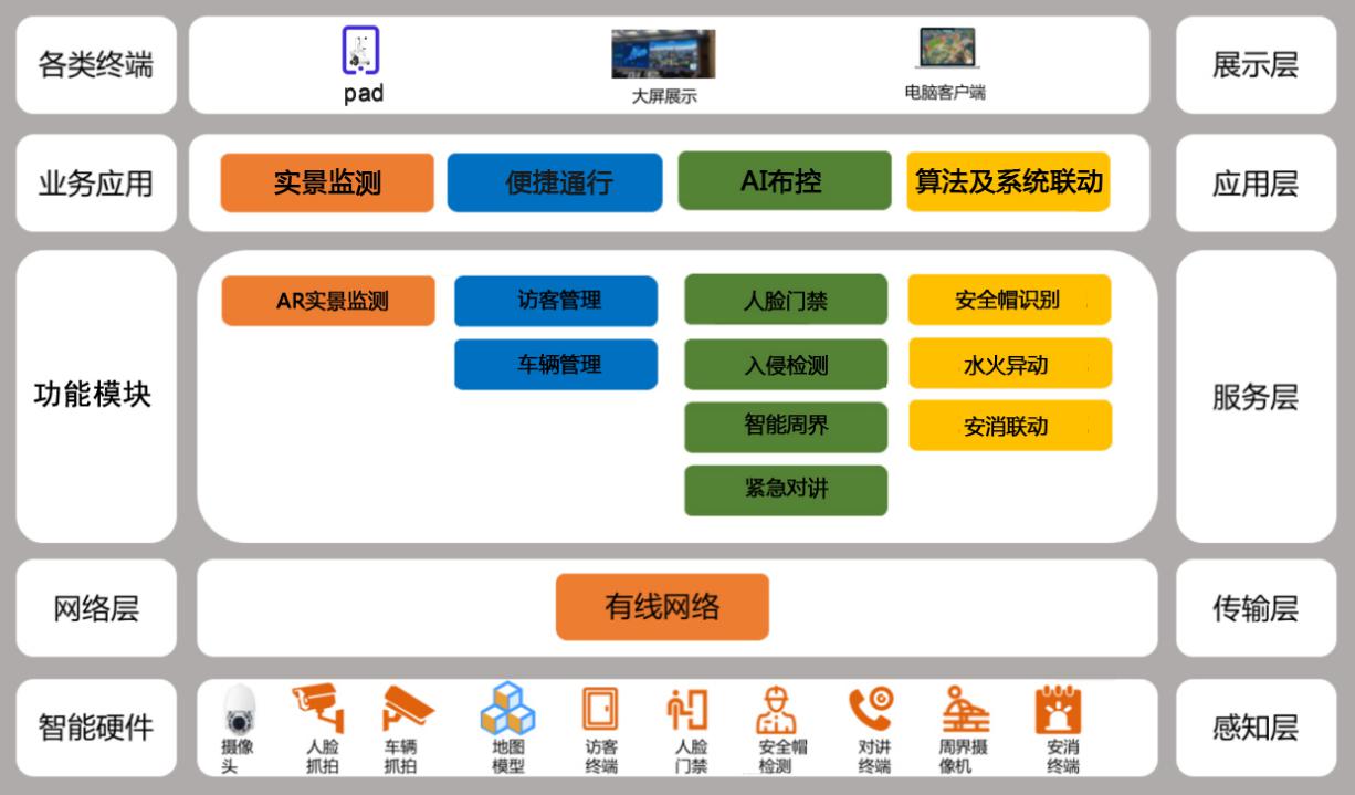 感知層:系統(tǒng)前端感知設(shè)備包含AR攝像頭、普通監(jiān)控?cái)z像頭,人臉識(shí)別攝像機(jī)、車牌攝像機(jī)、周界防范攝像機(jī)、明火檢測(cè)攝像機(jī)等告警終端/系統(tǒng)。