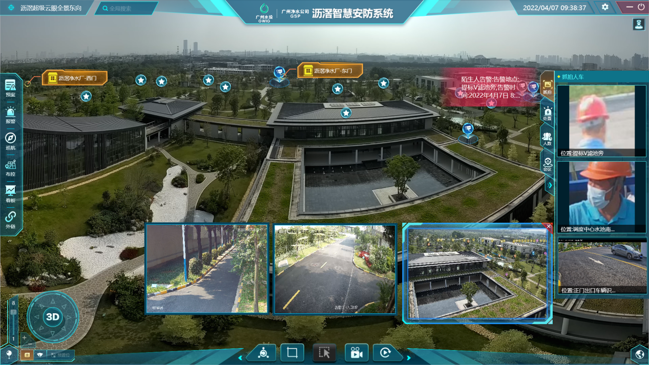 為強(qiáng)化傳統(tǒng)視頻監(jiān)控場(chǎng)景感知、應(yīng)用聯(lián)動(dòng)、告警處置、事后追溯等能力,在瀝滘凈水廠,廣州凈水公司運(yùn)用物聯(lián)網(wǎng)、AI、AR等先進(jìn)技術(shù),基于AR實(shí)景監(jiān)測(cè)平臺(tái),以AR攝像機(jī)的高空鳥(niǎo)瞰視角,將監(jiān)控范圍內(nèi)的各類防控資源在一張實(shí)景地圖上直觀呈現(xiàn),實(shí)現(xiàn)對(duì)各應(yīng)用場(chǎng)景的整合、數(shù)據(jù)信息融合處理和控制,提高園區(qū)智慧安防管理軟實(shí)力,打造可感知、可聯(lián)動(dòng)、可告警、可追溯的國(guó)內(nèi)示范性凈水智慧園區(qū)。
