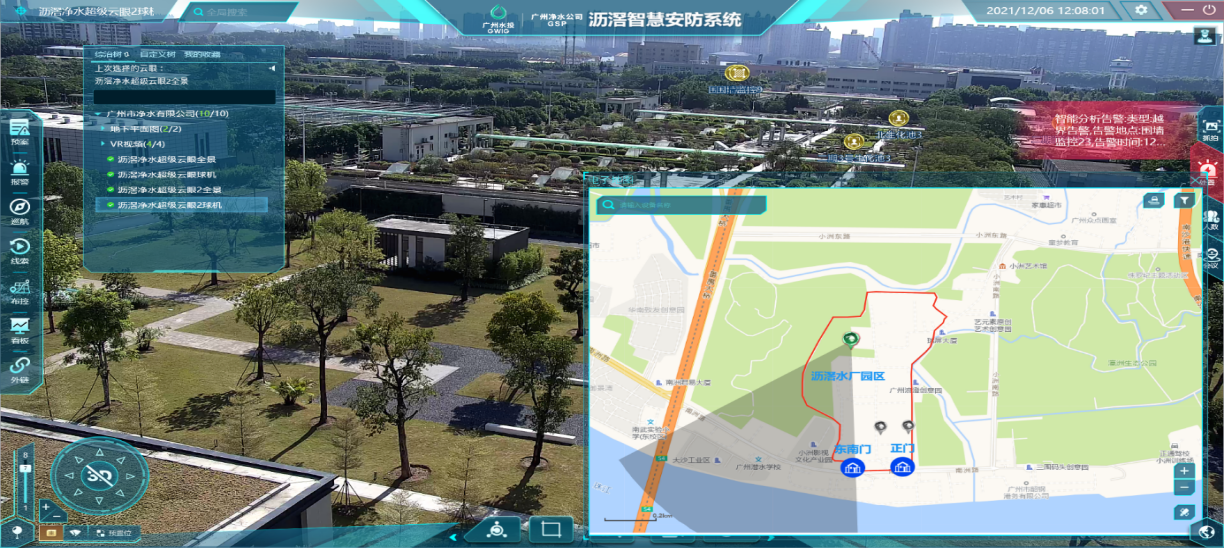 廣州凈水公司瀝滘凈水廠面向水務(wù)行業(yè)的需求,建設(shè)智慧安防系統(tǒng),構(gòu)建以實(shí)景地圖為載體的的智慧安全防護(hù)體系,支撐基于“無(wú)人值守、少人巡檢”智慧凈水廠的落地。其本質(zhì)在于完成凈水廠安全防護(hù)智慧化全面升級(jí),實(shí)現(xiàn)園區(qū)安全管理的智能化、標(biāo)準(zhǔn)化及規(guī)范化,達(dá)到宏觀細(xì)節(jié)、虛實(shí)結(jié)合、內(nèi)外互補(bǔ)的“四圖合一”增強(qiáng)效果,以提升凈水廠安全管理要素、安全管理決策等全方位的智慧化水平,形成資源富集、場(chǎng)景豐富、告警閉環(huán)、高低聯(lián)動(dòng)的安防生態(tài)。