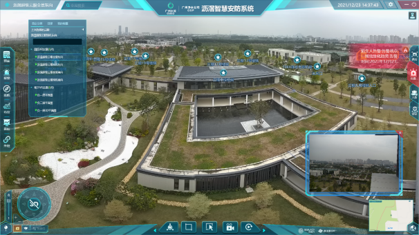 系統(tǒng)通過(guò)在空中俯瞰園區(qū)中各重點(diǎn)區(qū)域,結(jié)合增強(qiáng)現(xiàn)實(shí)標(biāo)簽標(biāo)注技術(shù),能夠?qū)@區(qū)畫面中的建筑物、道路、設(shè)施等進(jìn)行標(biāo)簽標(biāo)注;標(biāo)簽支持分層分類展示,標(biāo)簽可被搜索、定位;當(dāng)系統(tǒng)搜索到某個(gè)目標(biāo)位置時(shí),系統(tǒng)畫面能夠自動(dòng)聚焦到目標(biāo)位置,并在監(jiān)控中心以最大畫面展示。整體形成一個(gè)大屏實(shí)景地圖,能給監(jiān)控人員帶來(lái)非常直觀的臨場(chǎng)感,直觀快速掌握?qǐng)@區(qū)整體安防情況。