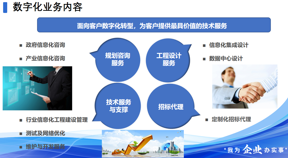 普天設計數字化業務主要包含:規劃咨詢服務,工程設計服務,技術服務與支撐,招標代理等,具體內容如下圖: