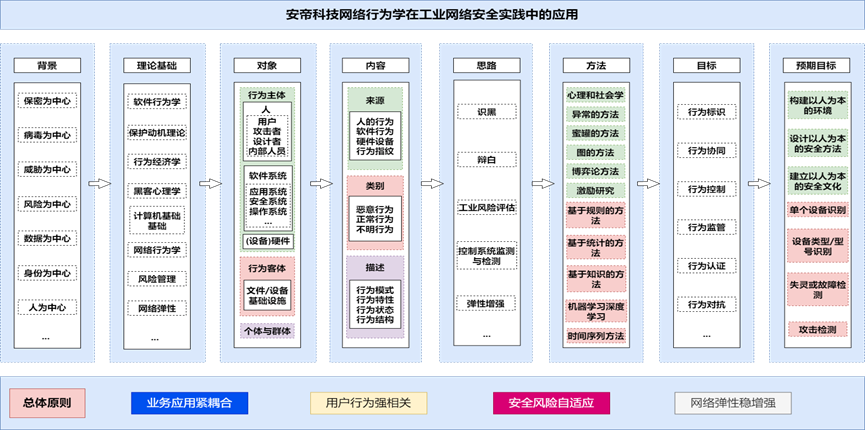 基于安帝科技創立的初衷和使命,結合當前網絡安全在OT側發展的困境,我們選擇網絡行為學作為推動OT網絡安全理論、技術、產品、方案、服務等發展的方法論指導。網絡行為學在OT側網絡安全能力建設中落地應用,具體就是對主體(人、設備、軟件、系統)的行為的分析評估,以及對客體或行為的受體(系統、軟件、硬件)的監測分析,用以甄別異常、故障、網絡攻擊。試圖通過與用戶業務場景、業務要素的融合,發現業務行為的模式、特點、規律,從而建立正常業務行為的模型,達成拒絕一切非業務模型行為的目的。