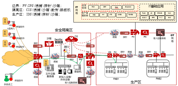 該電子制造基地的安全實施,以保證業務連續性為目標,采取管理約束和技術保證雙管齊下的策略,根據生產實際述求,本著先改造IT后增強OT的安全實施理念,提出了被動的靜態防御和主動防御相結合的安全部署方式, 通過嚴格的安全隔離和訪問控制機制等傳統的靜態防御手段,為生產基地構建獨立的網絡安全防護圍墻;在此基礎上,引入主動防御的安全工具,通過先進的安全防御工具,來彌補攻防的不對稱問題,提高應對未知威脅的反應能力和預警能力,確保工控系統運行環境的安全性。