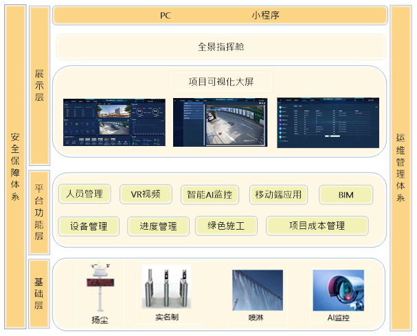該項目從工地實際業(yè)務(wù)需求出發(fā)進(jìn)行頂層設(shè)計、系統(tǒng)規(guī)劃,充分考慮業(yè)務(wù)數(shù)據(jù)的共通性、串聯(lián)性,整體架構(gòu)分為基礎(chǔ)數(shù)據(jù)層、平臺功能層、前端展示層: