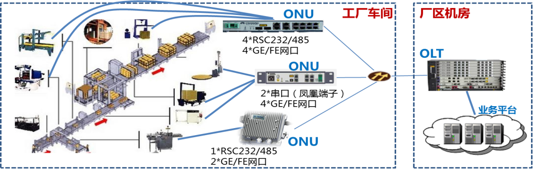本解決方案,適用于承載不同企業規模的離散型、流程型制造業的各類工廠內網絡業務。通過工業PON終端設備提供工業場景下的不同類型物理接口,可為工業控制、信號量監控、數據傳輸、語音通信、視頻監控、無線網絡承載等各種業務應用提供支持。